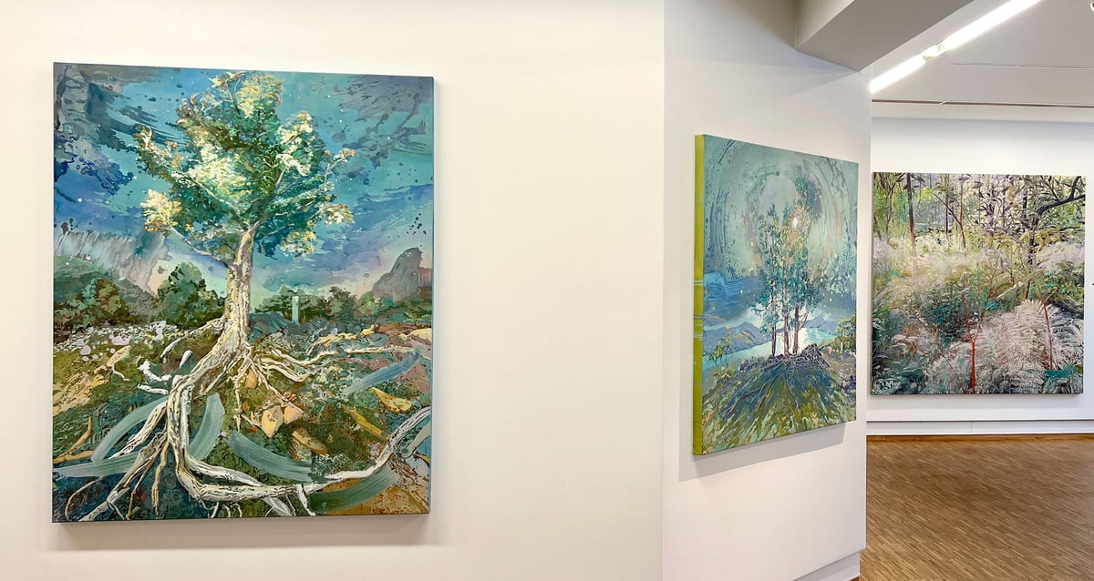 Sabine Beyerle er også optaget af skovens livscyklus: vækst, forfald og fornyelse. Denne tankegang giver malerierne en tidslig dimension, som minder os om, at naturen hele tiden forandrer sig. De synlige penselstrøg og de detaljerede overflader skaber en intens stemning, hvor skoven både virker virkelig og drømmende på samme tid.
