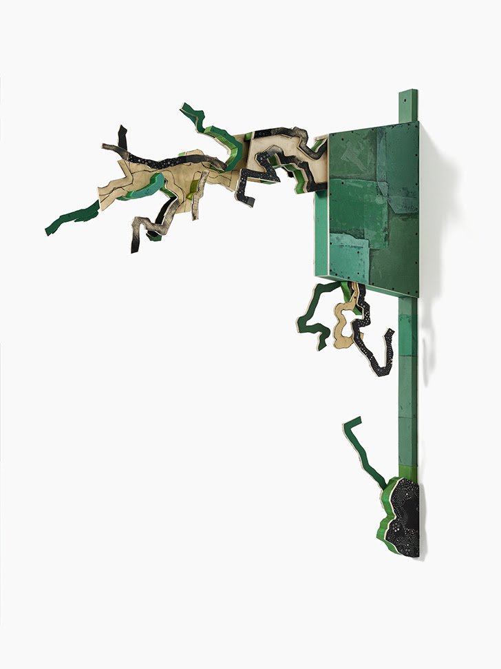 I flere af de nye værker er skabelonkomponenter blevet skåret ud, dels af krydsfinerplader og dels af de to sorte læder “ark”. De fungerer derfor som det oprindelige billedfelt, hvorfra alle komponenter er afledt. Som følge heraf finder en proces sted med kontinuerlig akkumulering, modifikationer, nedbrydning og nydannelse af komponenter samt konstruktion af klynger af aktivitet. Interne ændringer i funktion og i forskellige komponenters betydning er måske mest tydeligt i værket Closing all openings (Ceausescu–yellow). Uensartet formede læderkomponenter skåret ud af det “forladte”, hængende og foldede læderark på venstre plade bliver nu brugt som en samling af “propper” til at udfylde huller og sprækker i forskellige størrelser på højre plade. Det gule beholderlignende objekt fungerer som en skraldespand fyldt med overskydende udklip af læder. Beslægtede skift og komponenter med forskelligartede funktioner, opstået under opbyggelsesprocessen, er også tydelige i udstillingens andre værker. Disse nye værker eksisterer generelt som konstellationer af segmenter, brud, invasive træk, pauser og indskud af spor.
