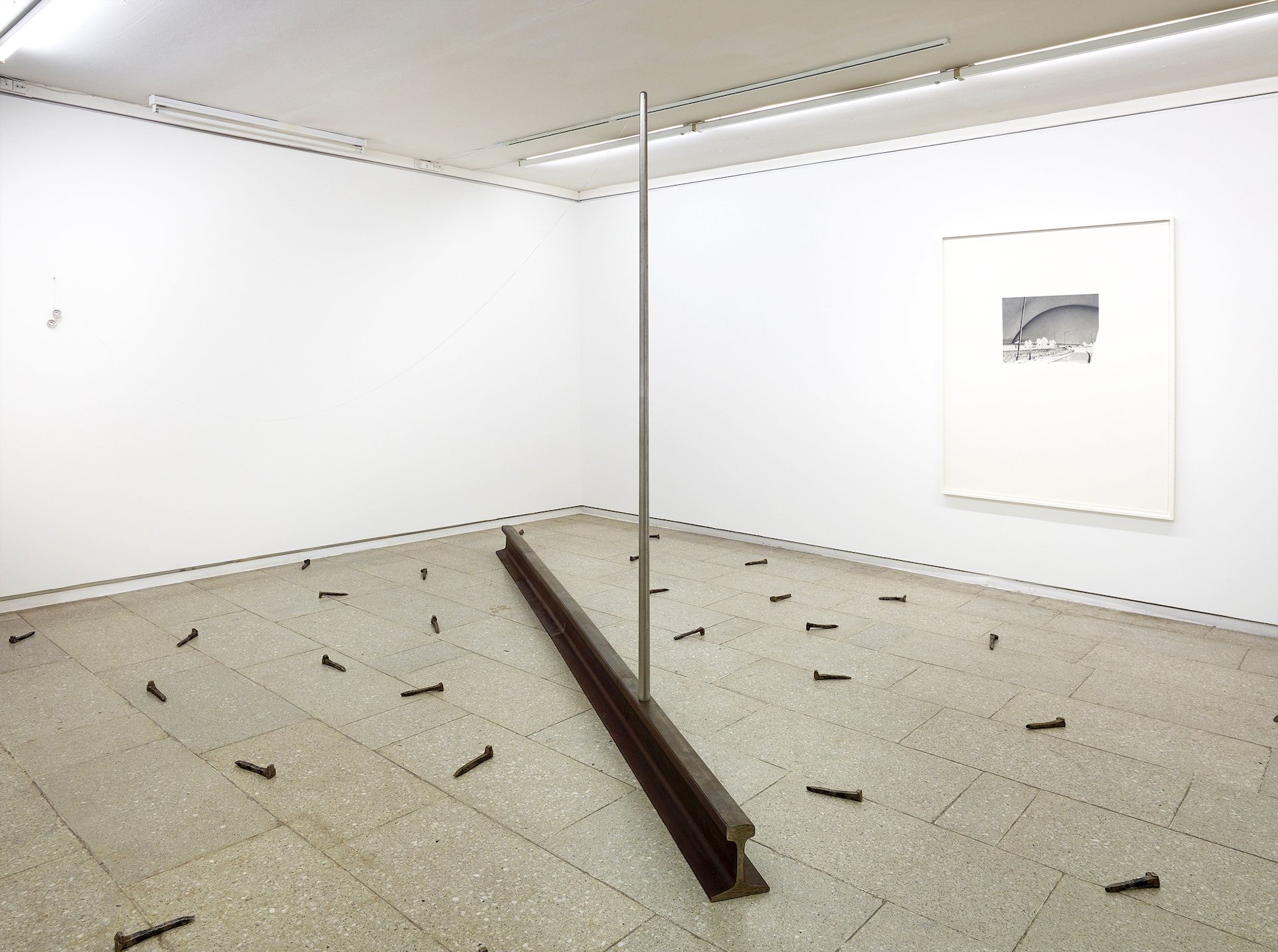 Værket består af en jernbaneskinne placeret horisontalt på gulvet med skinnenagler strøet ud omkring, en vertikal jernstang fastgjort som en mast på togskinnen og en lang sølvkæde, der som en slap telefonledning forbinder masten med væggen samt et par næsebriller eller ‘pincenez’, med indfattede dollarmønter fra 1890.