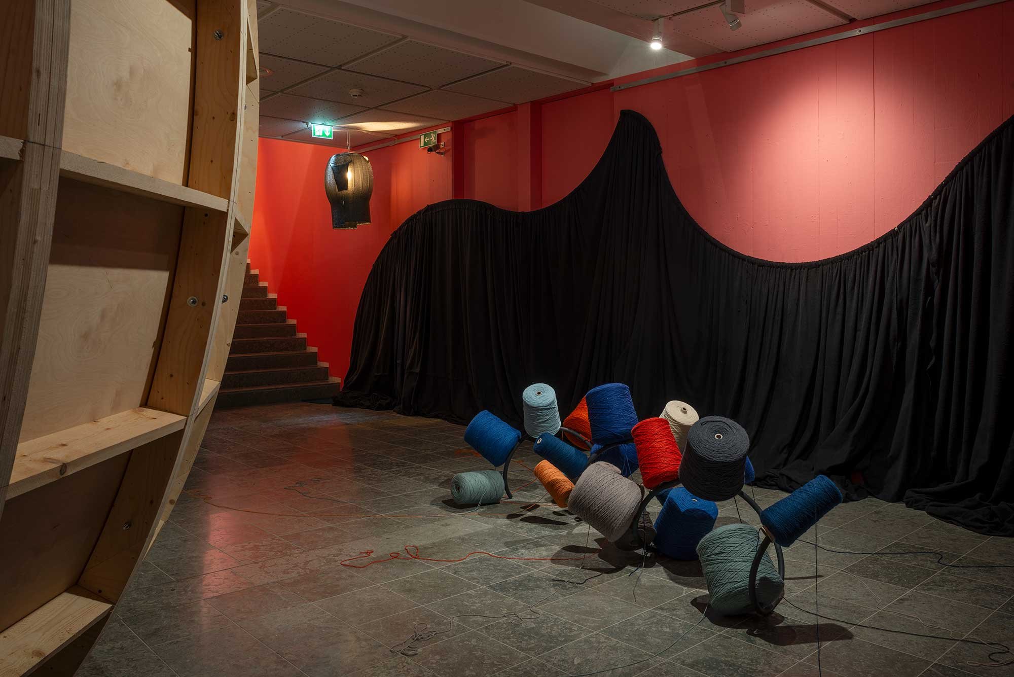 AKT 3 SPOLE-RUSEN. Tråden er altid tekstilets og beklædningens begyndelse. Over tid, og gennem mange hænder, vil spole-spiralen strække sine tråde ud i havet som en brandmands tentakler. Foto: Jacob Friis-Holm Nielsen