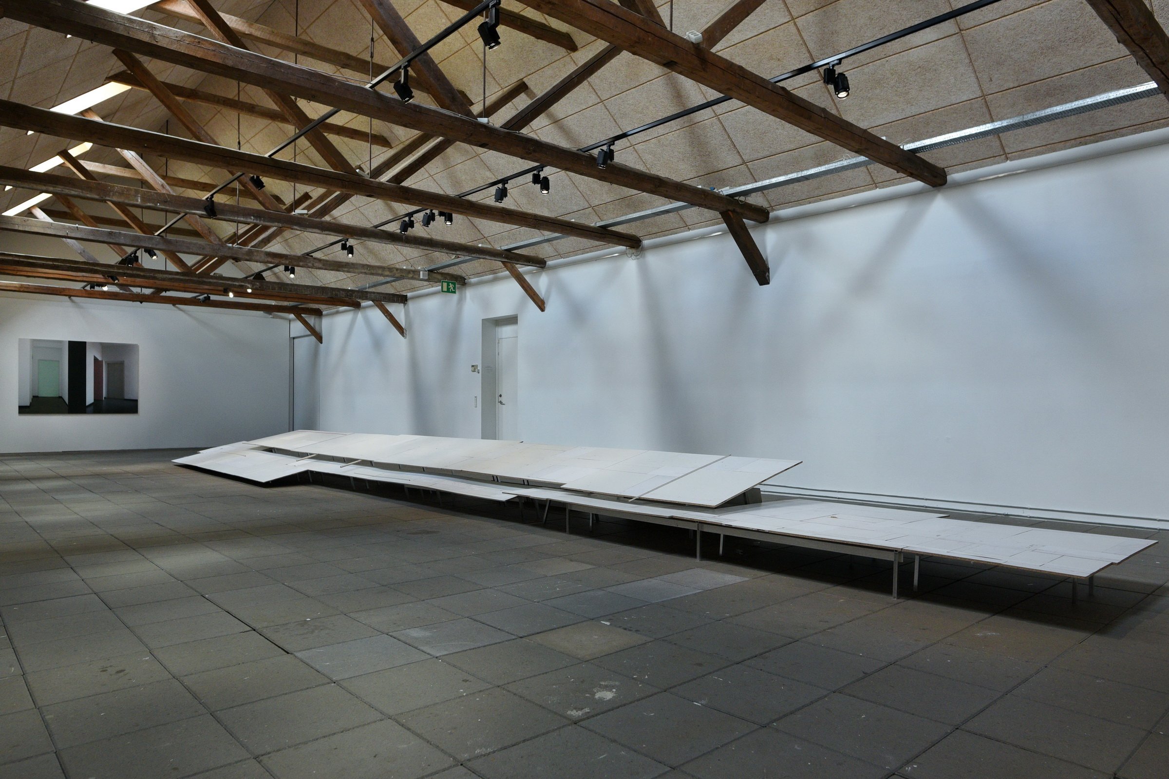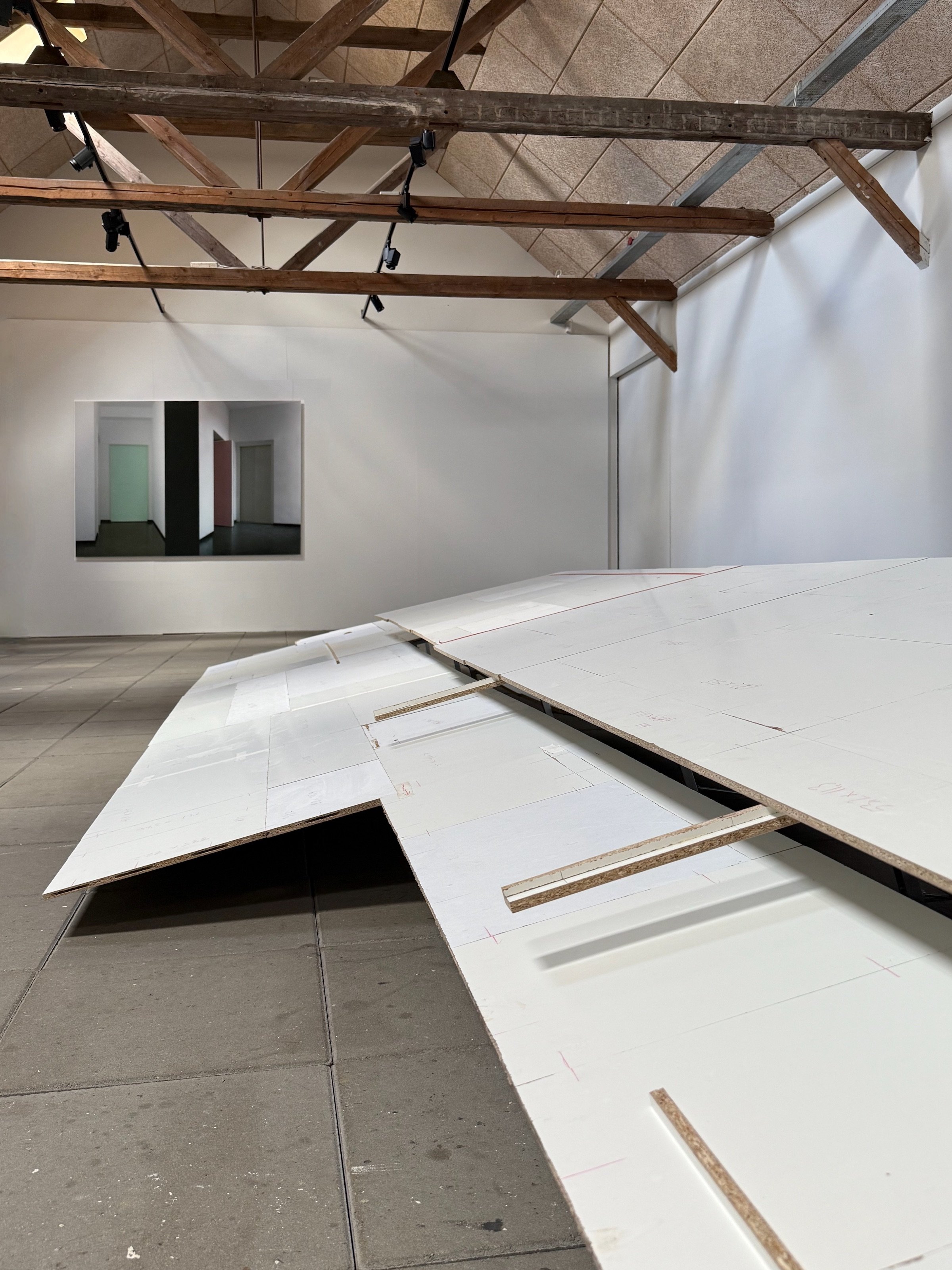 Michael Mørk, 15:40, 2025. Laminat betrukket spånplade/ aluminium/ farveblyant, H = 10 – 60 cm; B = 90 – 150 cm, L = 15 m. Foto: Ole Jørgensen.