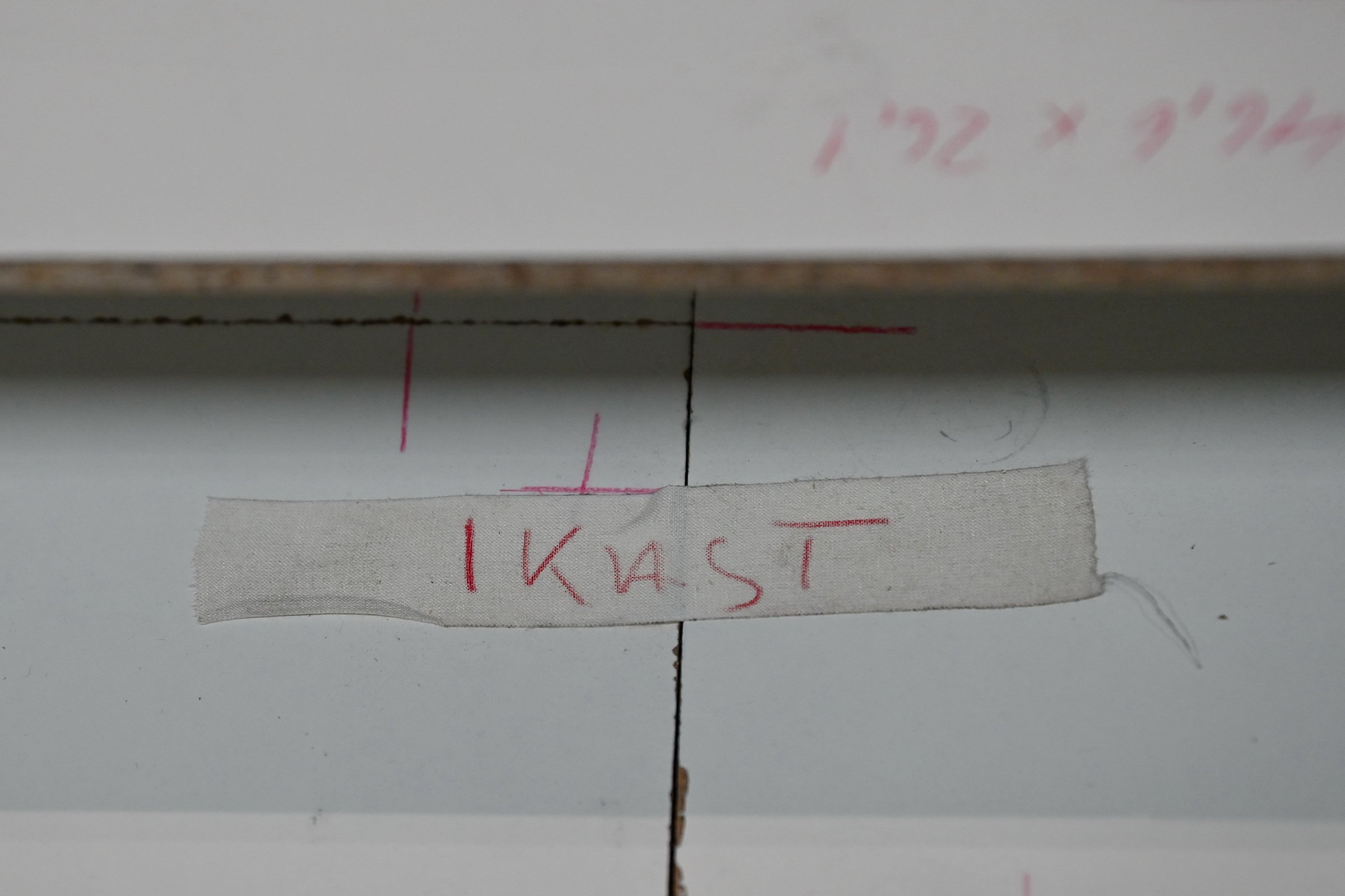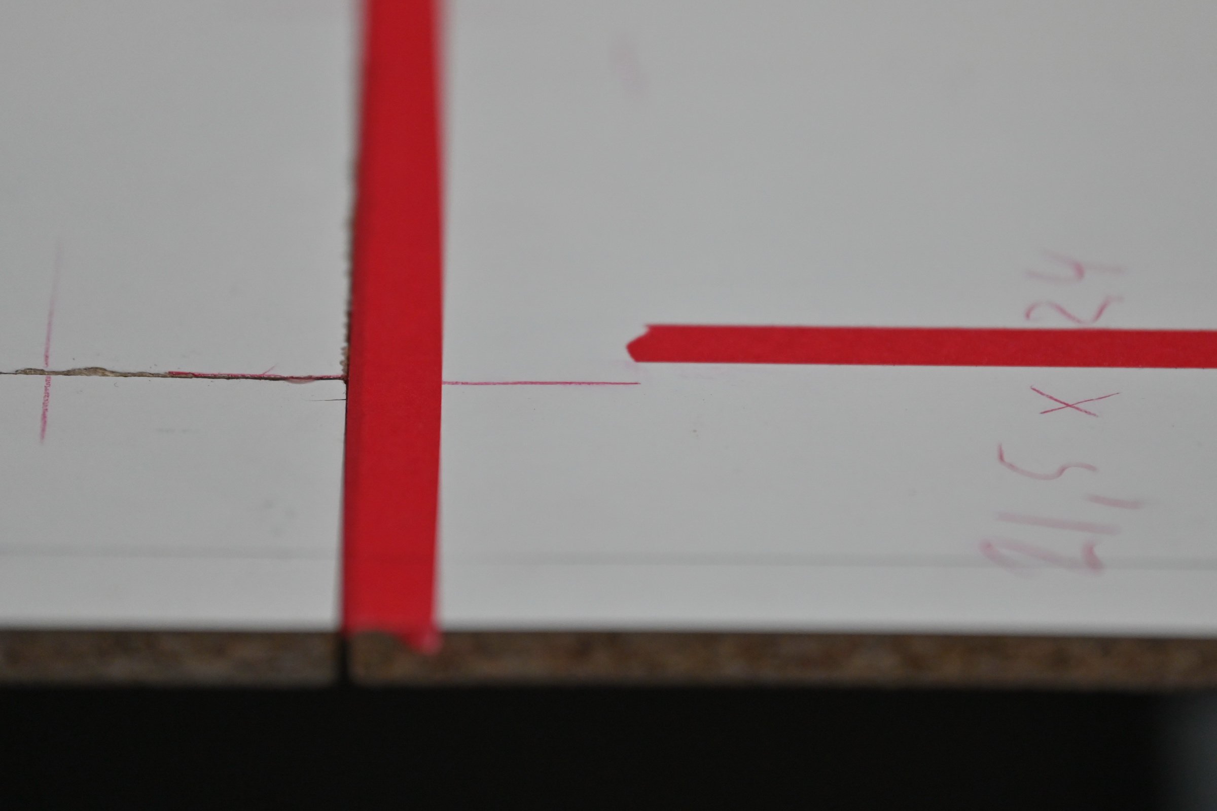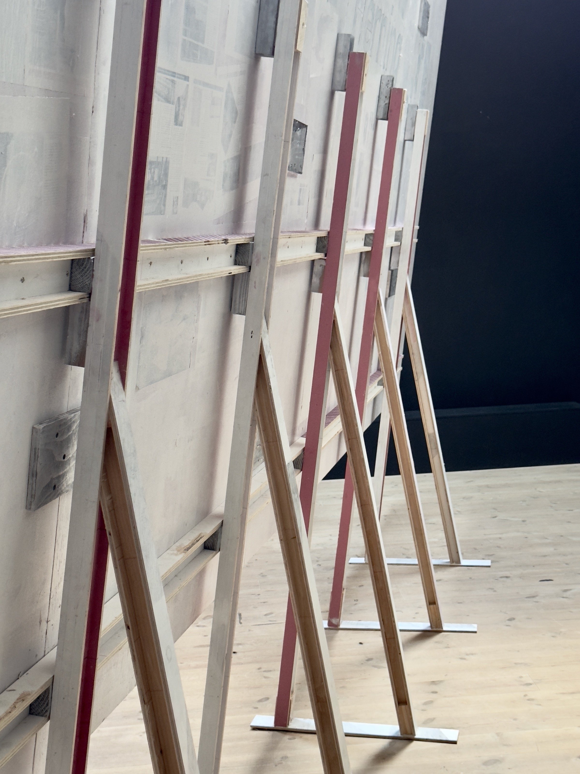 Michael Mørk, 15:40 (detaljefoto), 2025. Laminat betrukket spånplade/ aluminium/ farveblyant, H = 10 – 60 cm; B = 90 – 150 cm, L = 15 m. Foto: Michael Mørk.