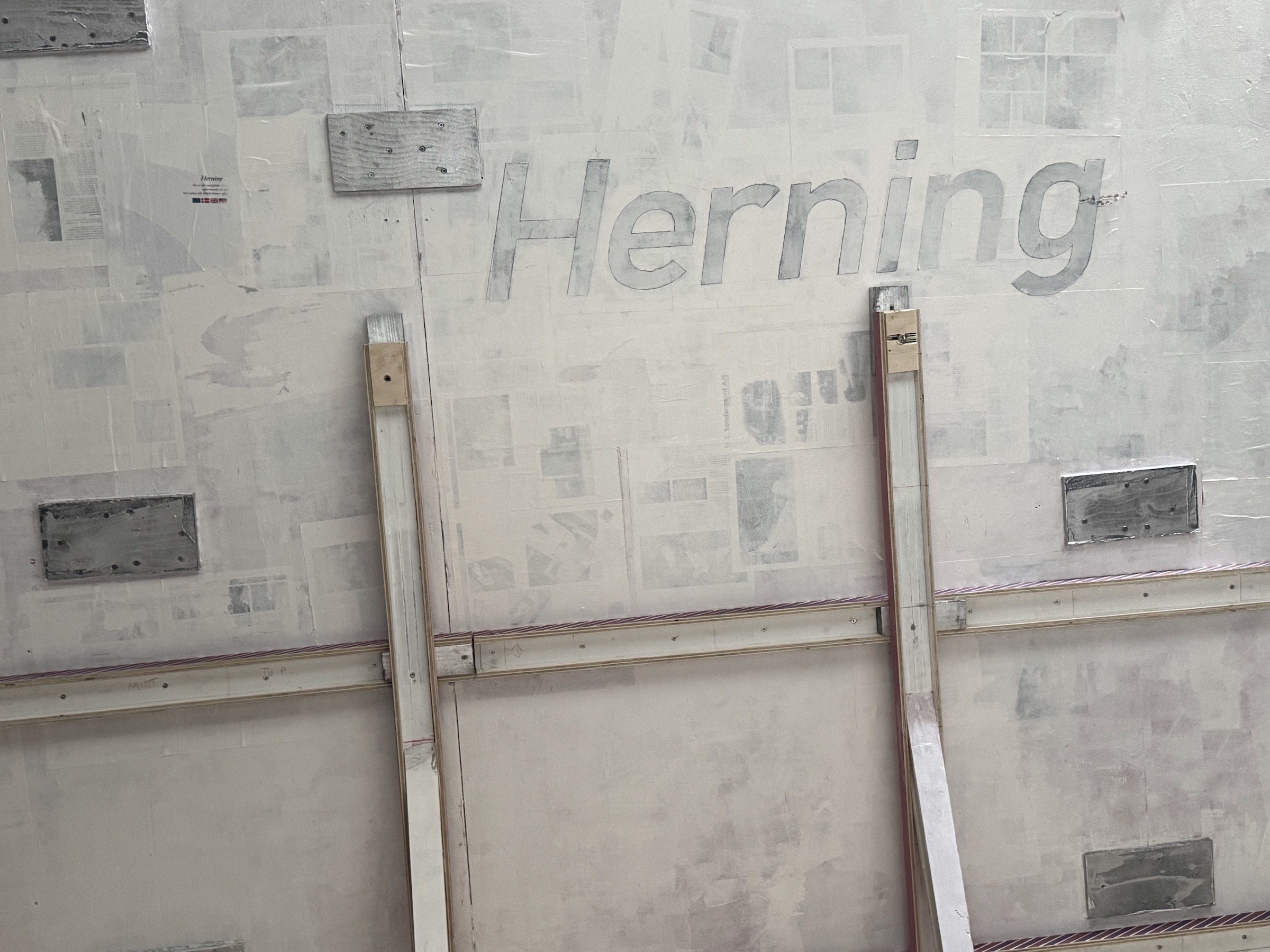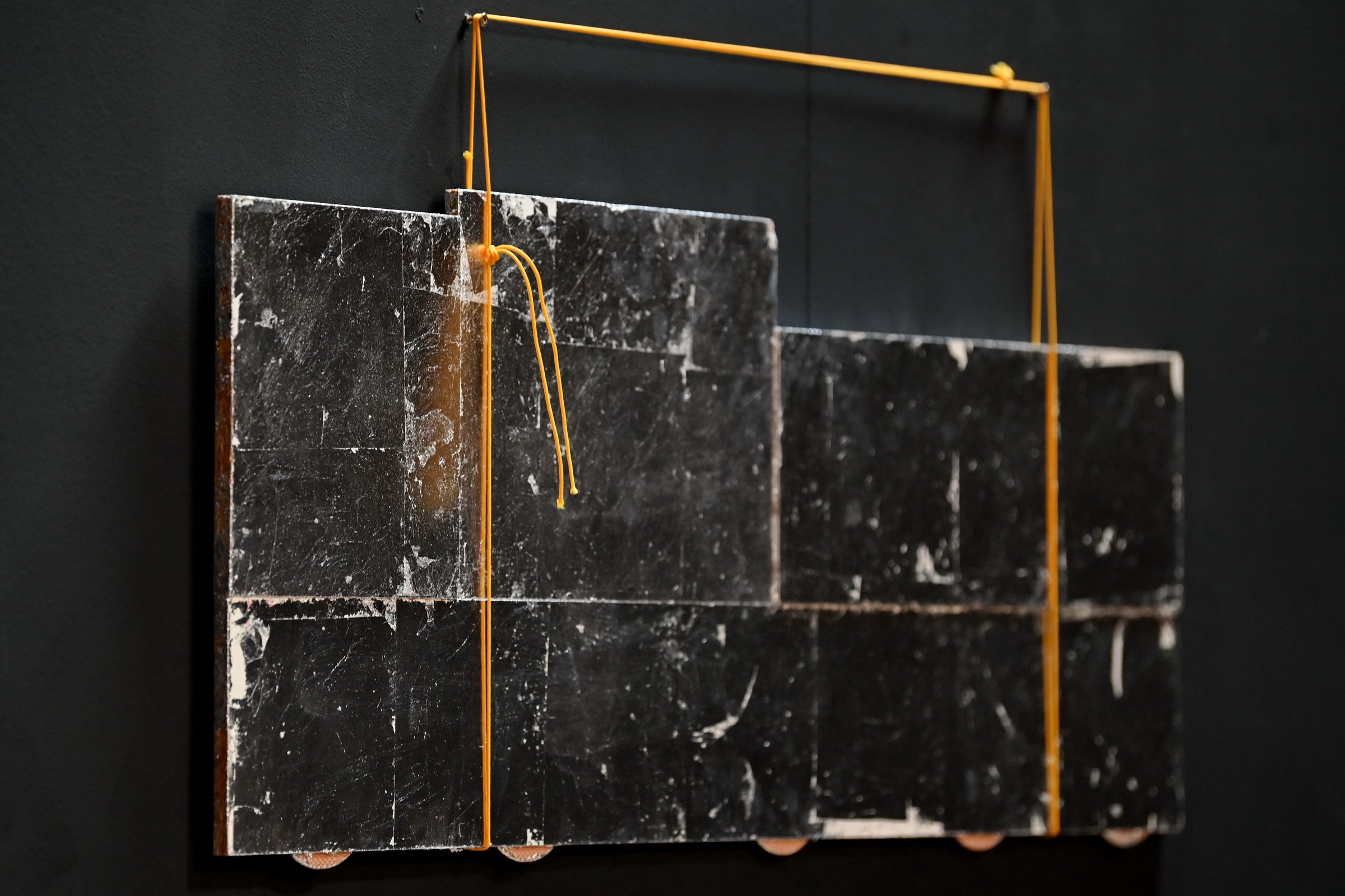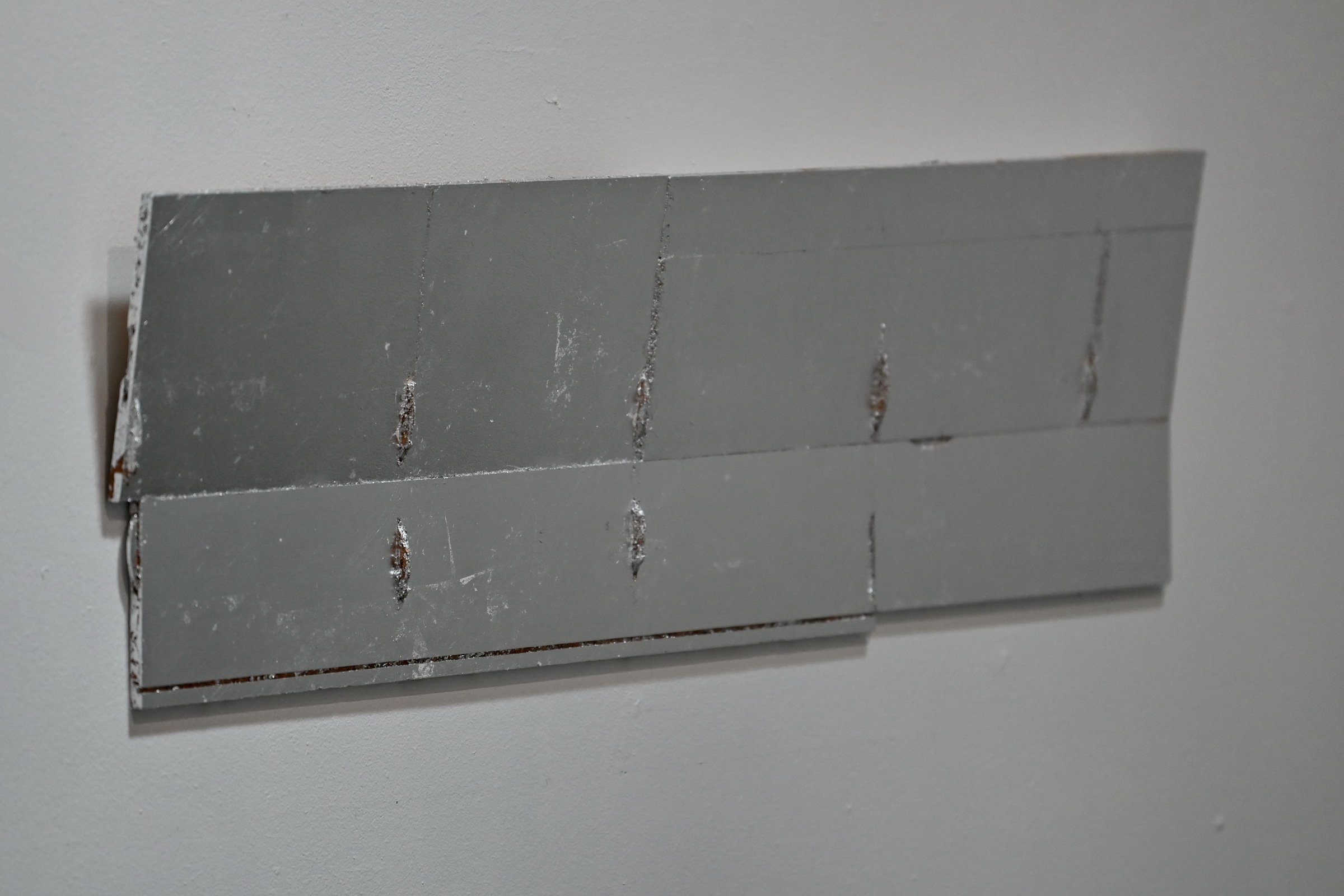 Michael Mørk, fragment, 2025. Slagmetal på spånplade, 33,5 x 116 cm. Foto: Ole Jørgensen.