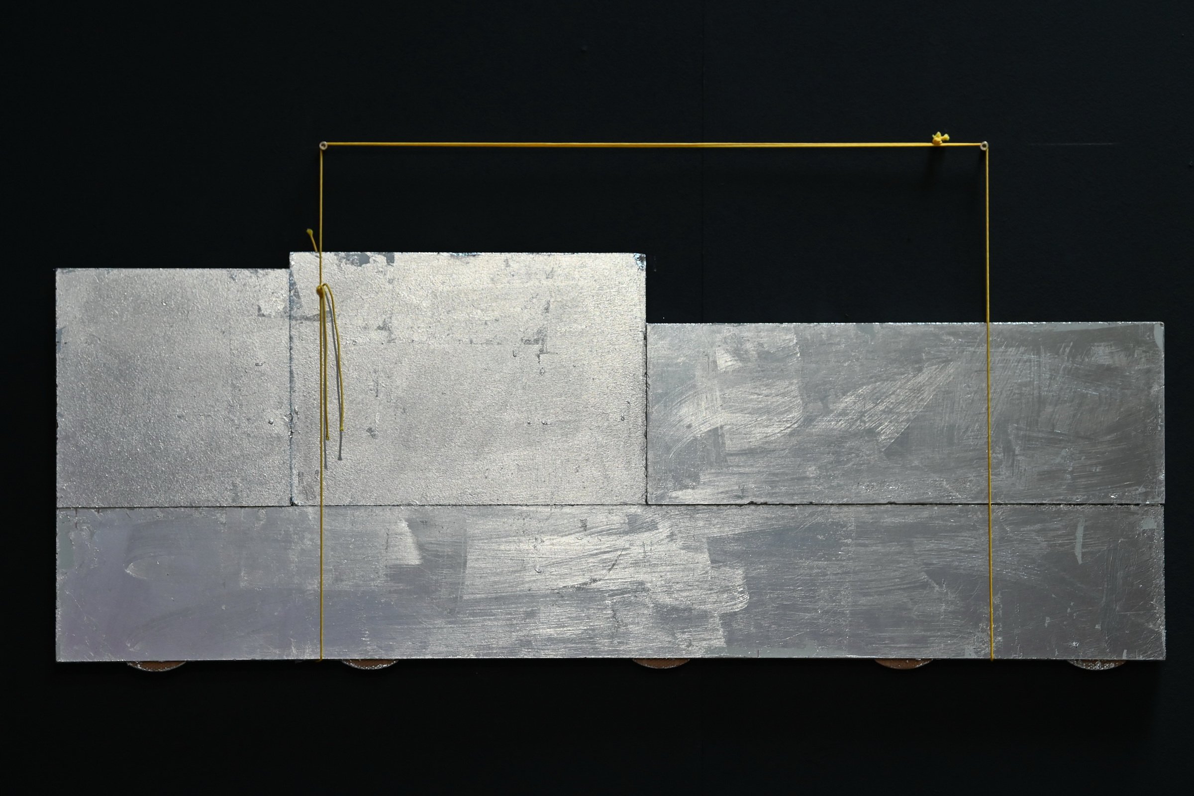Michael Mørk, Fragile Enviroment, 2025. Slagmetal på spånplade, 49 x 102 cm. Foto: Ole Jørgensen.