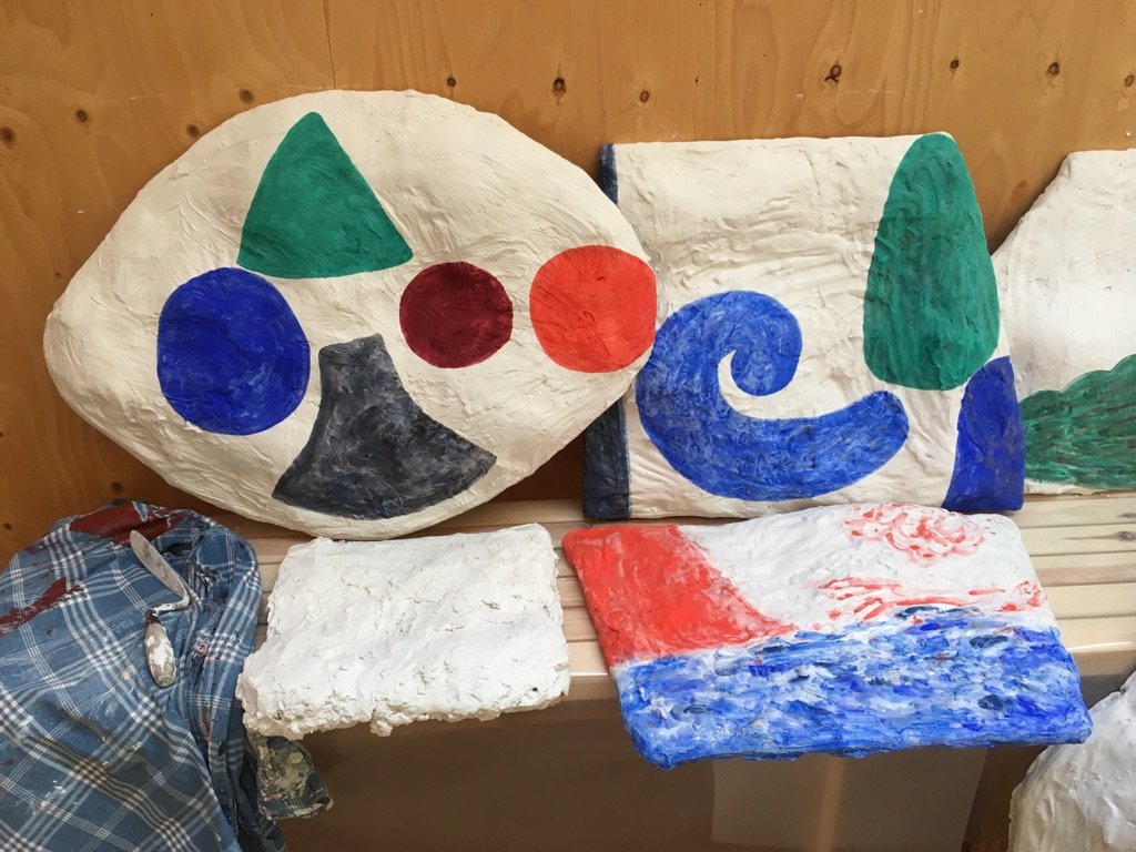 Specifikt til denne udstilling har hun udført en serie bemalede gipstavler, der fremstår som en hybrid mellem skulpturelle objekter og en form for nutidigt kalkmaleri. Tavlerne er bemalet med gouachefarve, hvor farvepigmentet ligger åbent og trænger ned i og går i forbindelse med gipsen. Værkerne besidder en robust kropslighed med deres let kurvede former, hvorimod bemalingen har en flygtig transparens, og kan opfattes som et abstrakt motiv eller et slags landskab.
