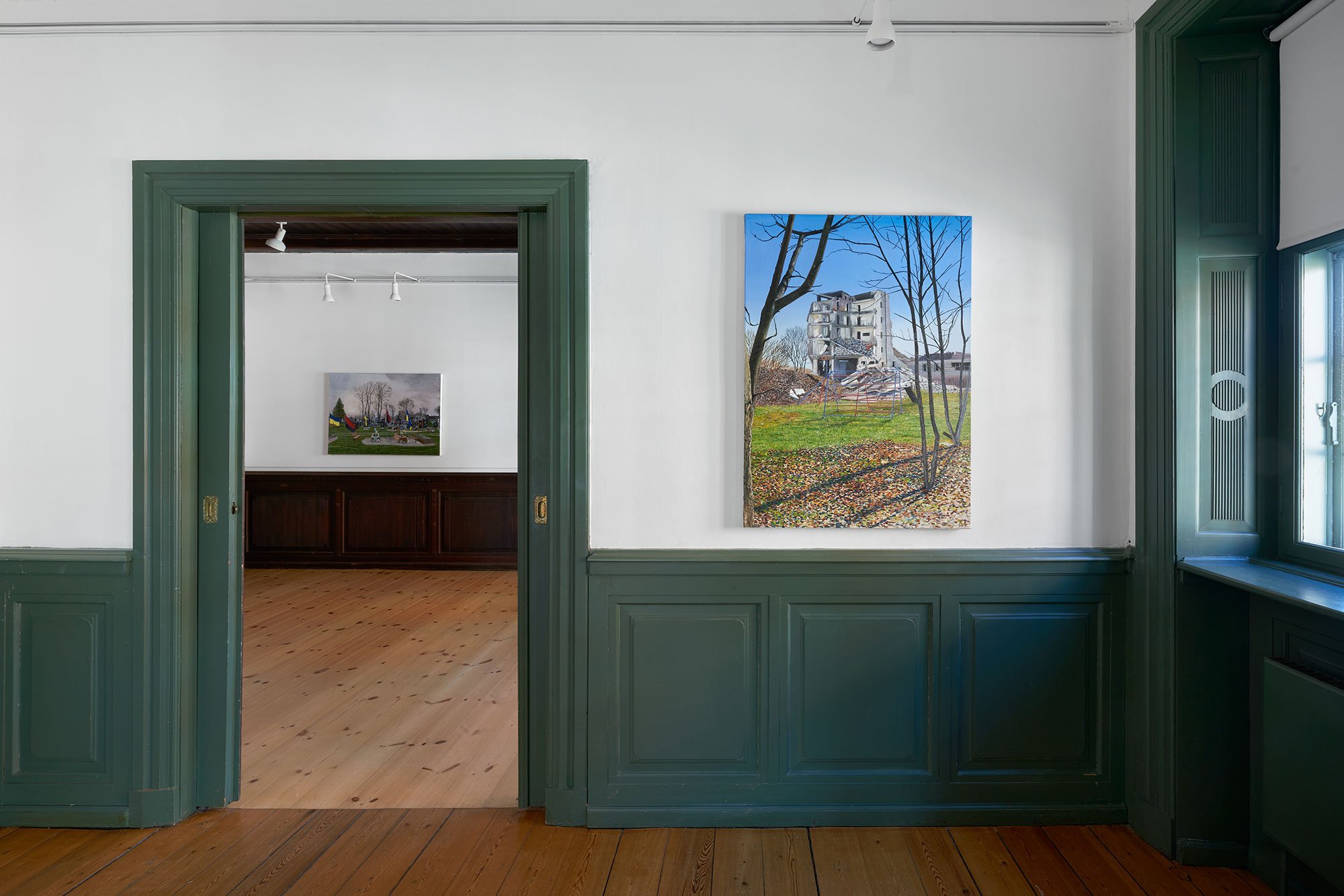 Søren Martinsen, Sønderskudte huse ved Lyman, olie på lærred, 80 x 110 cm, 2024. Foto: Brian Kure