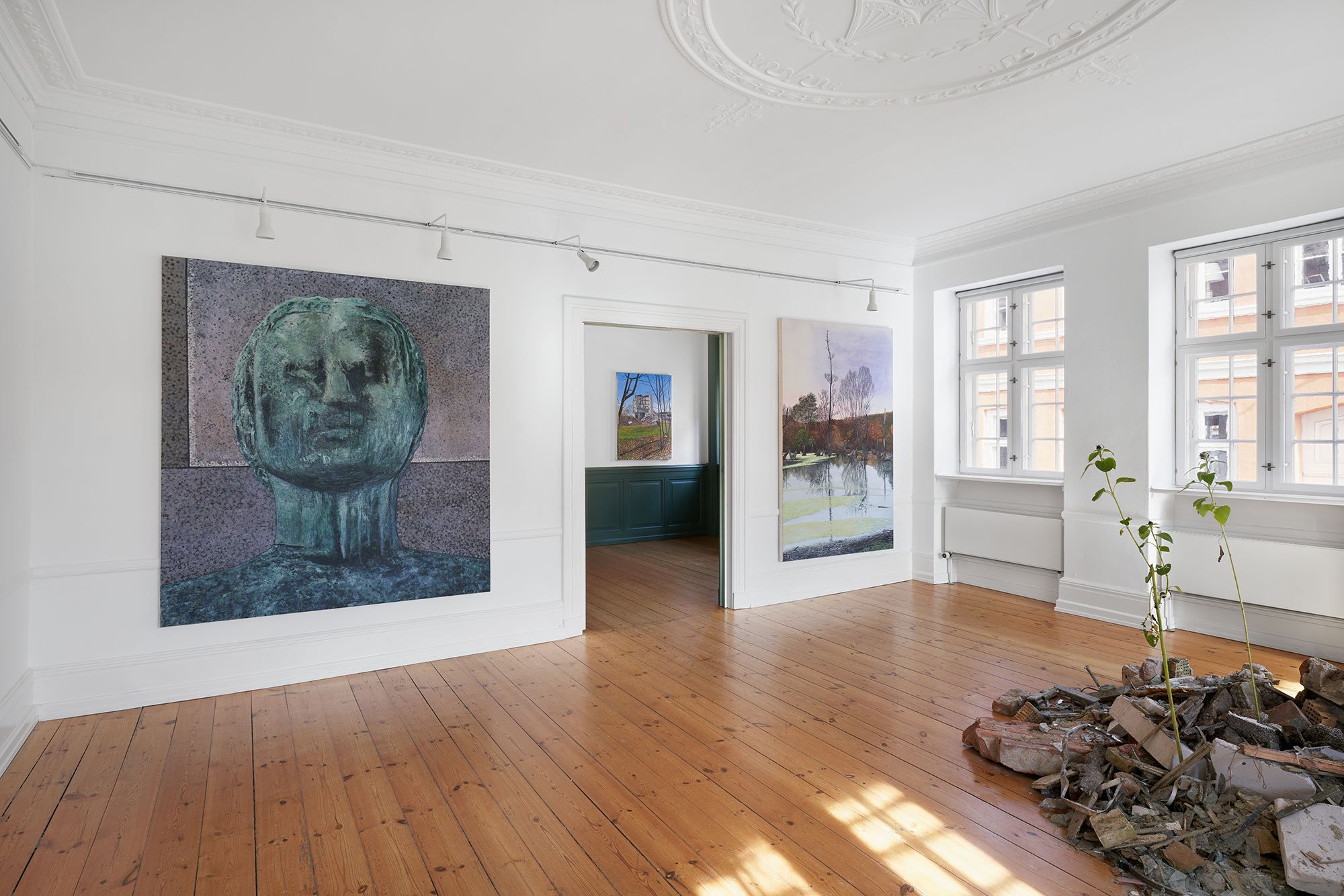 Installationsview m. Kvindehovede (Noack), 2020 + Izium, 2024 + Bog and Spine, 2021. Foto: Brian Kure