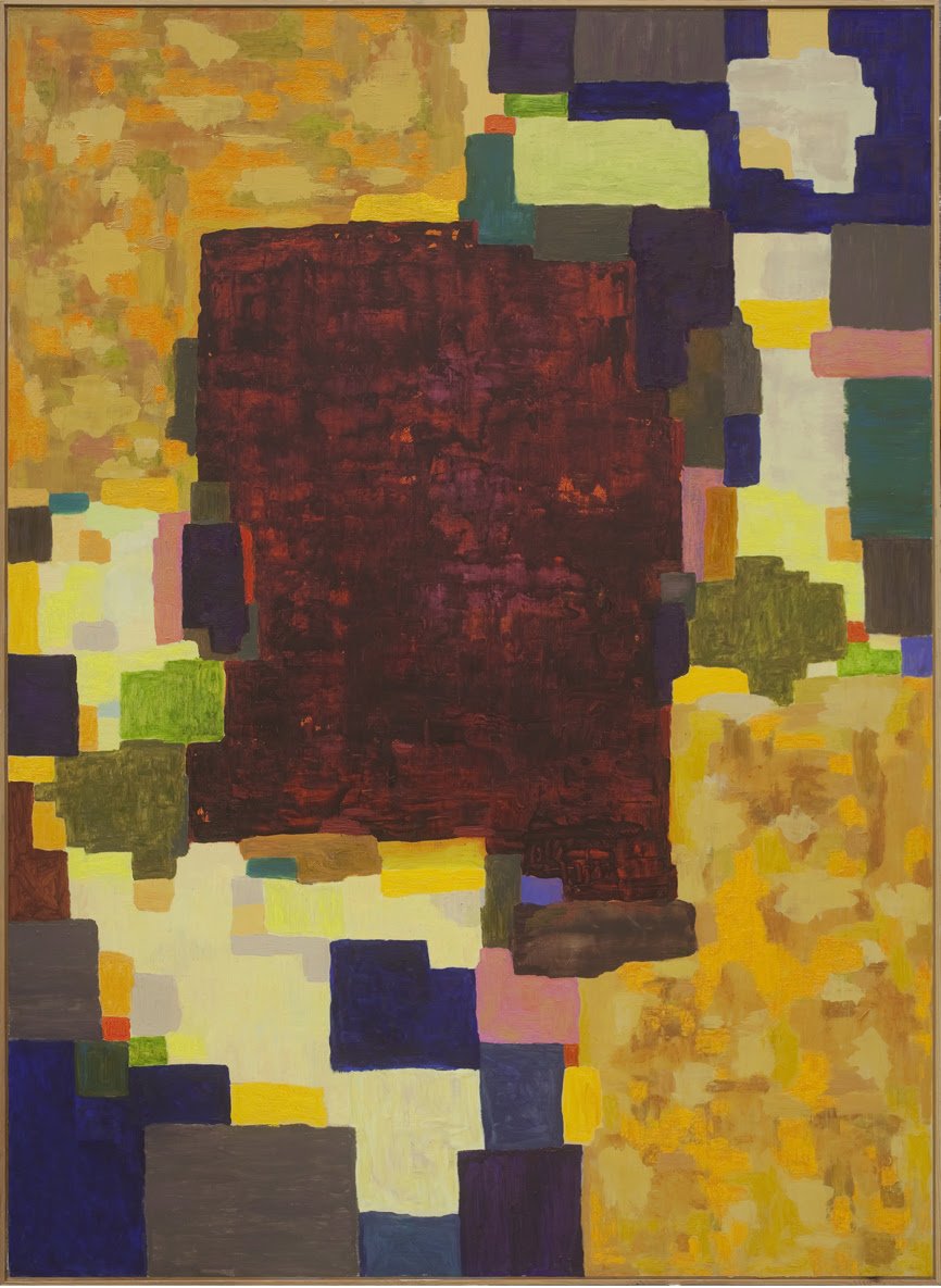 Hansons langsomme malerier påvirker mig rent kropsligt. Nogle af dem er ovenikøbet så store, at de indbyder til at fortabe sig i dem. De bløde mønstre sitrer på fladen. Felterne i disse all over-paintings, der kunne fortsætte uendeligt ud over rammen, har en egen rytmik, og farverne er spændt op mod hinanden. Kølige og varme, gule, røde, orange og grønne og så nogle store mørkviolette plamager eller ”huller” i mønstrene, der antyder et rum bagved. Det er både sanselige og meditative værker.