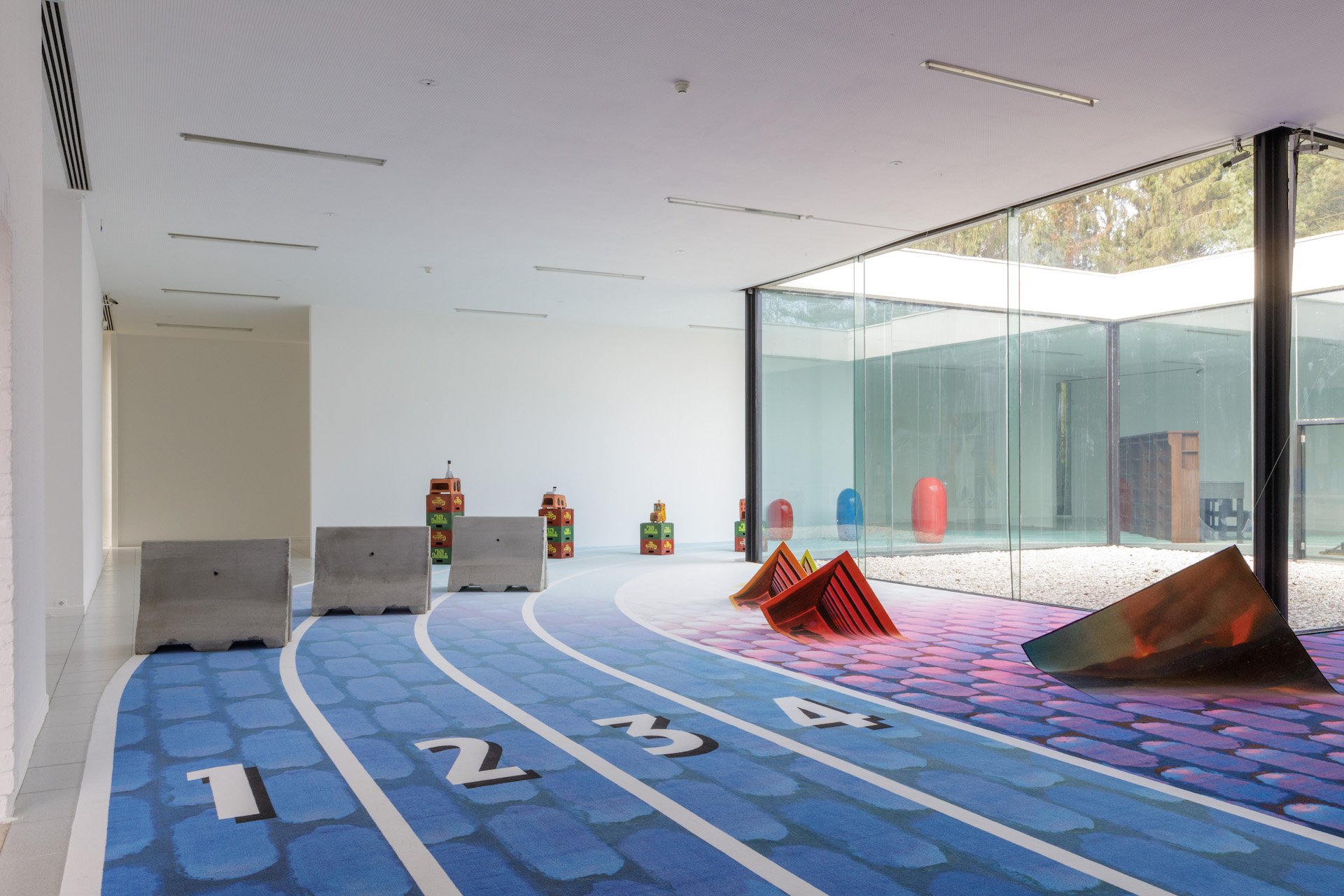 Under rundgangen er der en konstant bragende og super generende lyd, der udgår fra Monica Bonvicinis (f. 1965) videoinstallation Hausfrau Swinging (1997), hvor en nøgen kvinde med et hvidt hus på hovedet uophørligt støder ind i et hjørne.