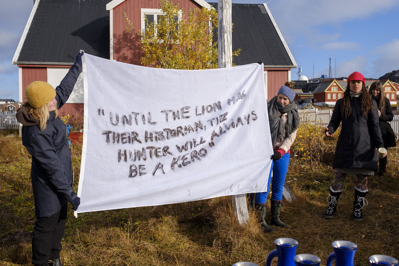 “Until the lion has their historian, the hunter will always be the hero” stod der på Ehlers flag, skrevet med kul, trykt sort på hvidt. Jeannette Ehlers har i sin kunst arbejdet med kolonisering, med slavehandlen, den afrikanske diaspora, men måske først og fremmest med historieskrivningen; hvem skriver og får deres stemmer med i historien, og hvilke stemmer lades bagud, overhøres og glemmes. Jeg har sat Jeannette Ehlers i stævne en mandag i april 2020 over Skype. Jeannette fra Danmark, og jeg fra Grønland; i to nedlukkede samfund i undtagelsestilstand med Atlanterhavet imellem os.