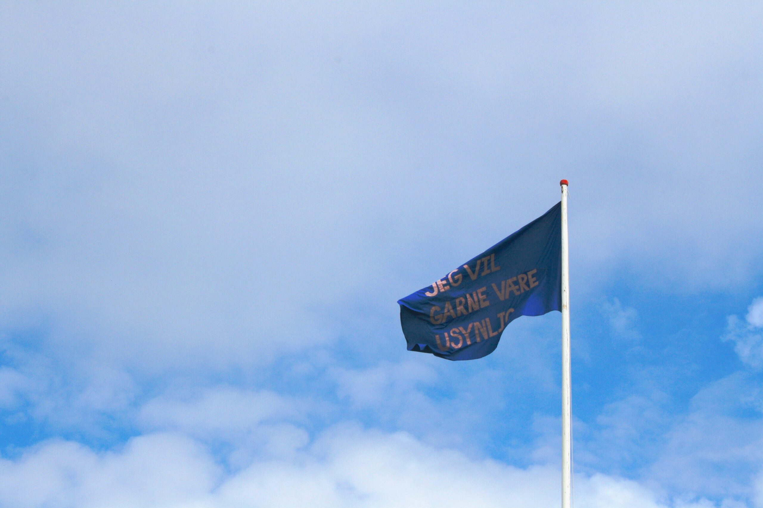 Gudrun Hasles eget flag indgik som det tredje i rækken af flag i Holms Hus. Det blev hængt op på en smuk dag, hvor solen efter dage med grå regn kiggede frem sammen med de nye myg. Flaget er blåt, stoffet er, som Gudrun Hasle tilfreds konstaterede, ikke farveægte, så det kommer til at bleges og langsomt nærme sig himlens farve. På den ene side står der med Gudrun Hasles ordblinde stavning: ”Jeg vil garne være usynlig”. På den anden side er der to øjne, et brunt og et blåt. Gudrun Hasle forklarer sit ønske at være usynlig som en reaktion på at komme til Grønland og opleve, at ens nationalitet pludselig fylder. Hvor man i Danmark kan opleve sig som anti-nationalist, som europæer og verdensborger, bliver man som dansker i Grønland konfronteret med, at man er dansk og har en kolonial fortid. På besøg i et andet land føles det krænkende at bede de hjemmeboende om at tale ens sprog, men det er jo, hvad man gør som dansk tilrejsende. Nationaliteten klæber til en, det er ikke muligt at være usynlig.