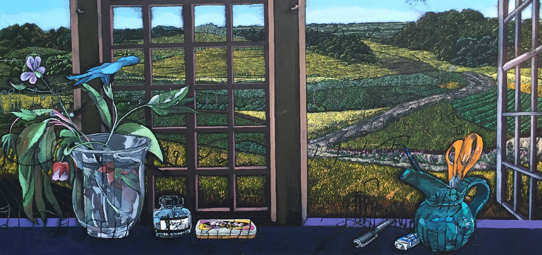 Der er fire landskabsbilleder med motiver fra Sydengland og referencer til TS Eliots Fire Kvartetter. De resterende er Paradismalerier fra Odsherred med behørigt nik til Dantes Guddommelige Komedie.