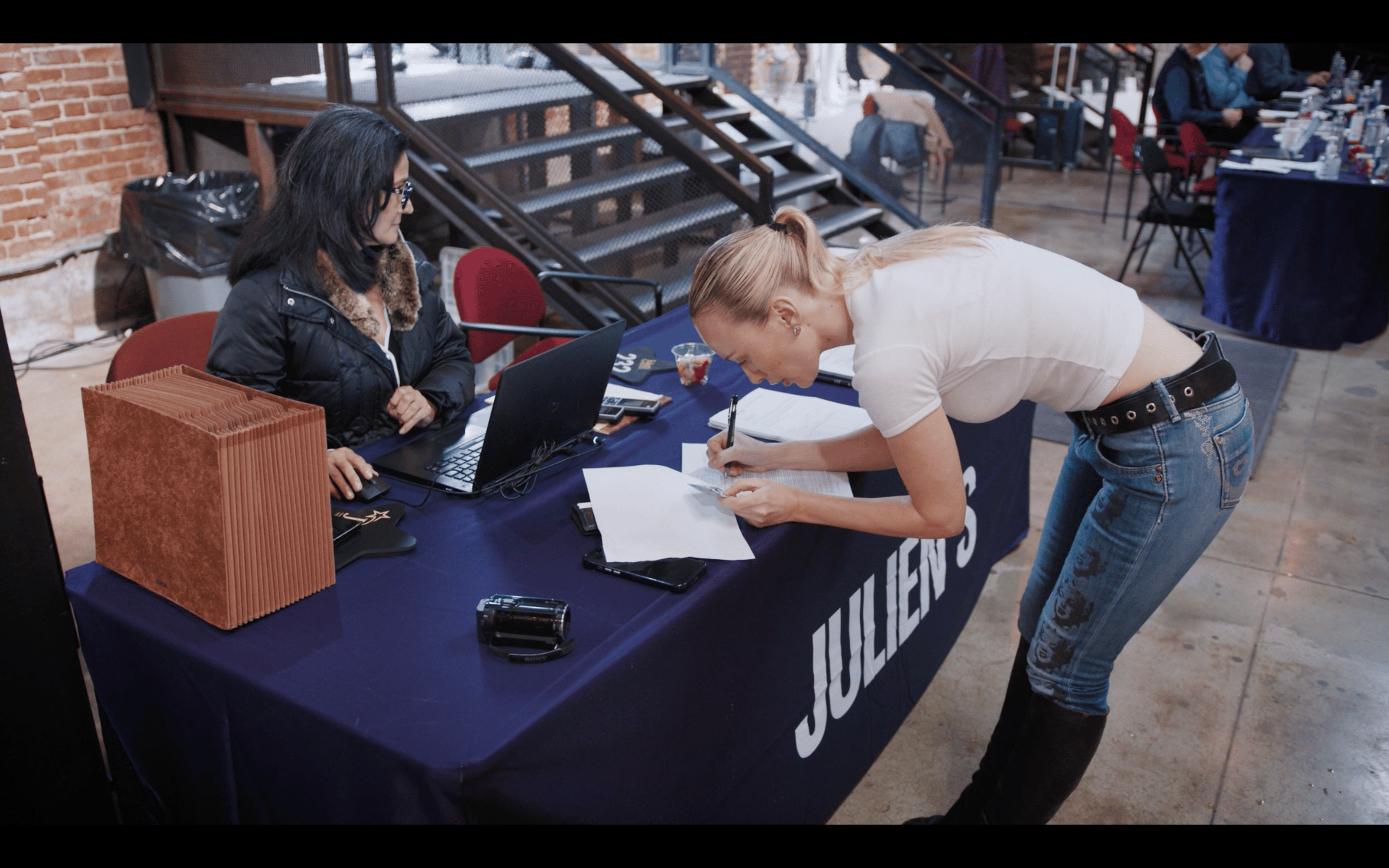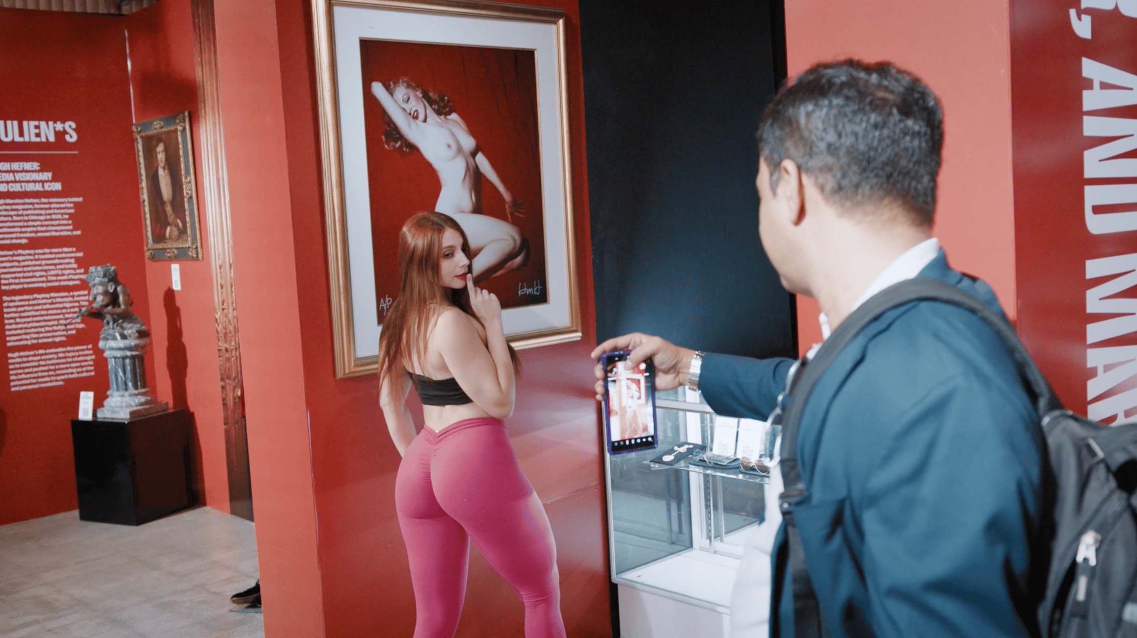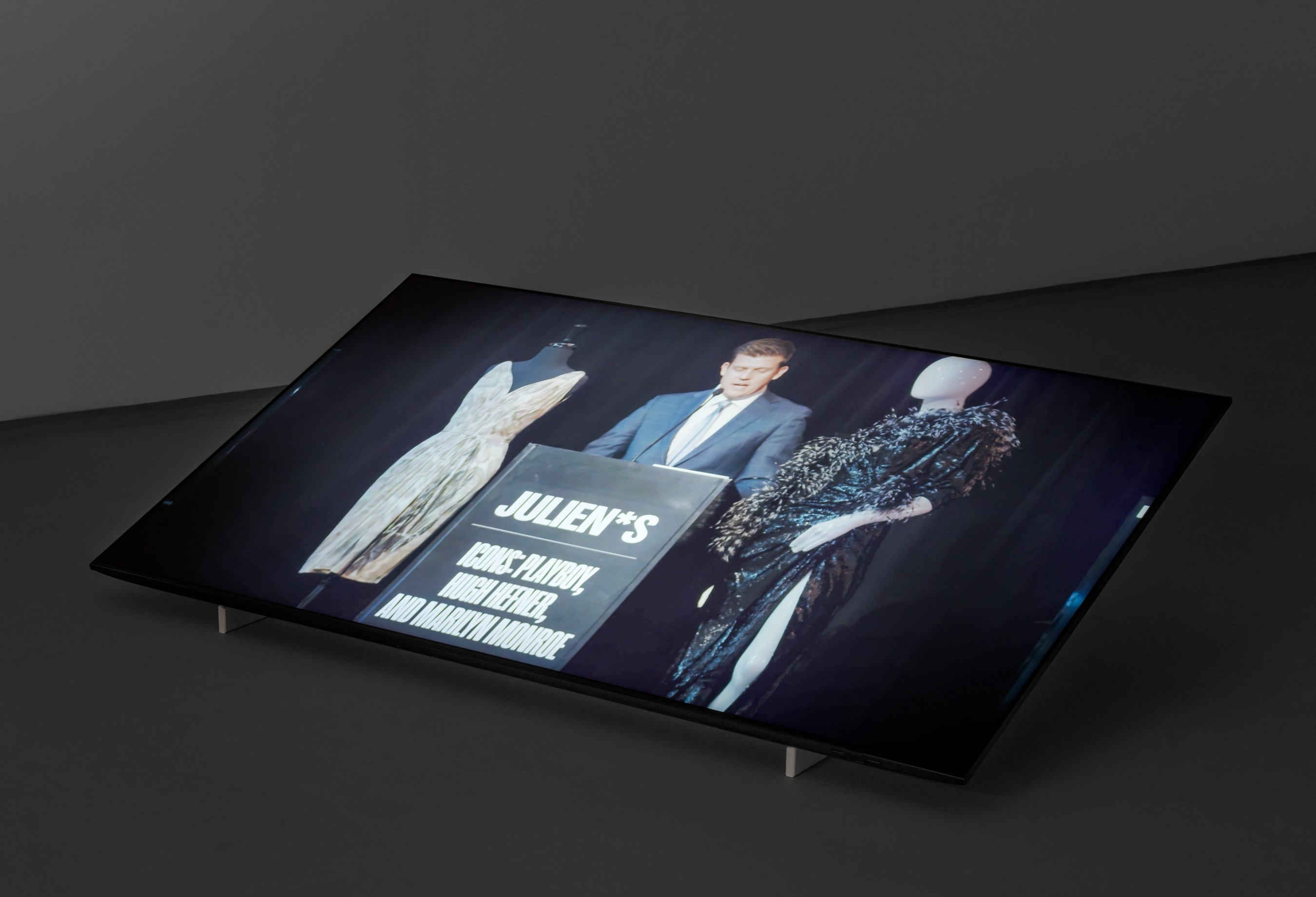 Stillbillede fra video i Maja Malou Lyse udstilling MM på Overgaden. Videoen omhandler købet af billedet af Marilyn Monroe på en auktion i Hollywood.