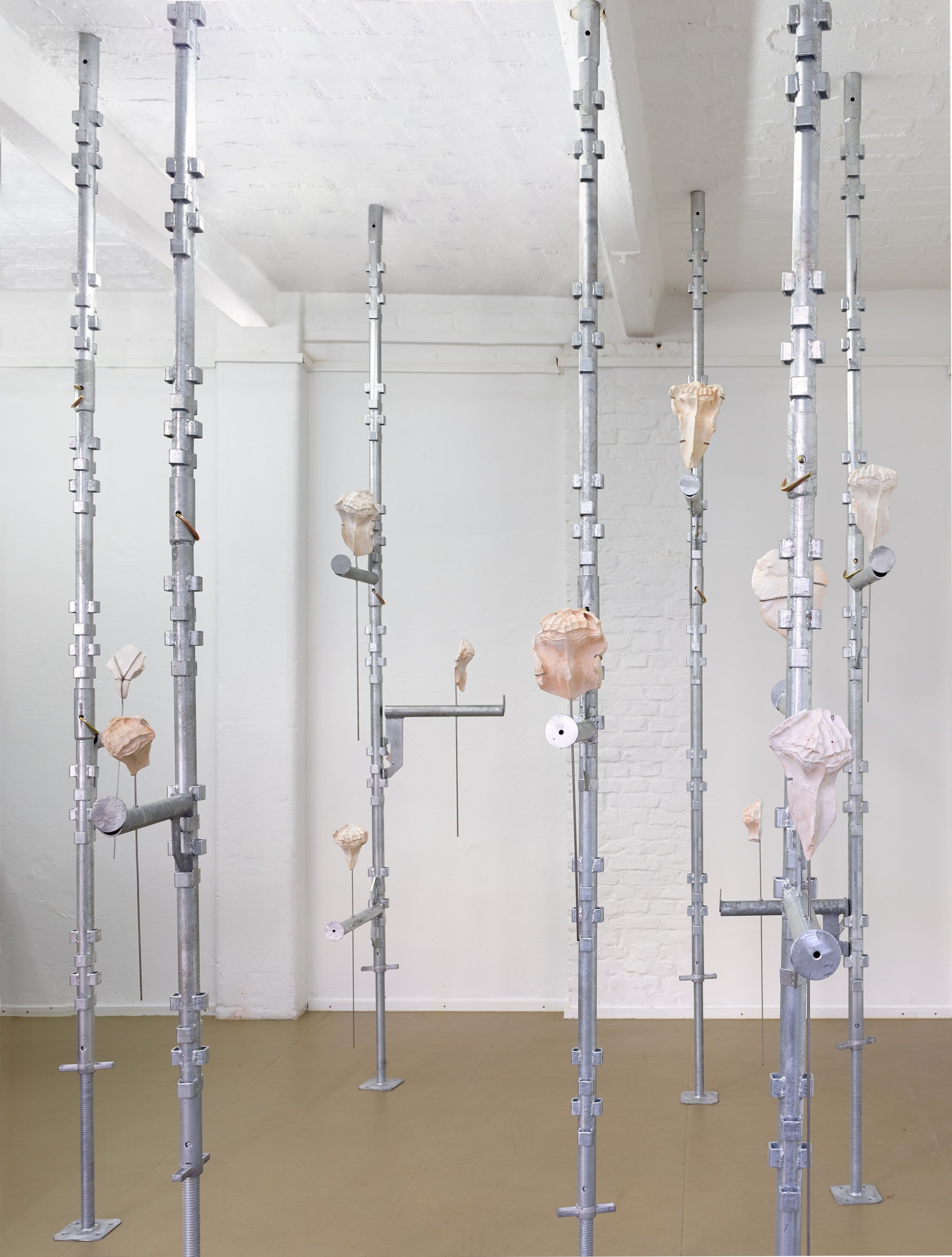 Under en del af denne proces løftede Stockholm gips op fra en spand og lod det tørre mellem sine hænder. Igen og igen. Disse afstøbninger, hændernes negative aftryk, er blevet til installationens centrale del. På KH7 er de monterede på et stillads, hvorved de refererer tilbage til selve det håndværksmæssige bag konstruktionen. Men som de hænger dér, ligner de også ansigter. De stirrer ligesom tilbage. Møder vores blik. Og i By Hand er de samme aftryk blevet brugt til at danne nye, denne gang ved at blive presset ind i leret.