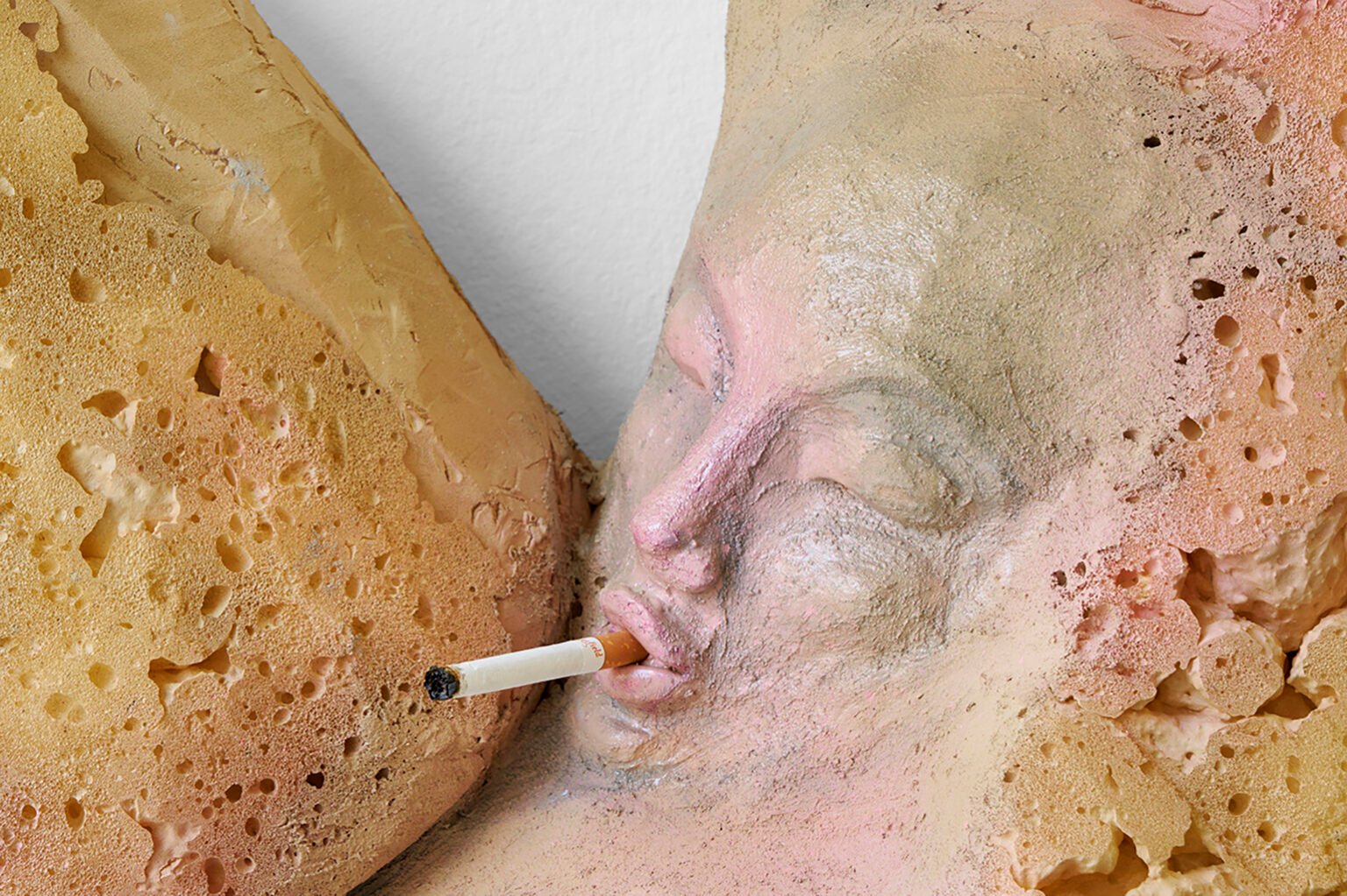 Eksempelvis i et stort femdelt relief med titlen I put a peephole in my flesh, hvor fire monstrøse og fragmenterede kroppe slynger sig med spredte ben, knogler, der stikker ud, svampede lår og flagrende bryster (silikonebryster i bogstaveligste forstand!). Og – ikke mindst – blottede åbninger, køn, sår, flænger og huller, der åbenbarer værkernes materialitet: beton, skum og – ja – silikone.