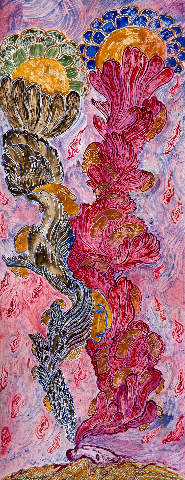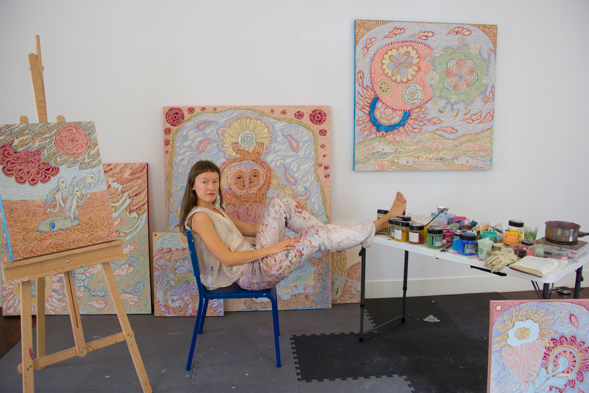 Hendes ritualistiske performances giver kropslig form til de væsener, der bebor hendes malerier, mens hendes skulpturer udfolder og udvider de universer, som hendes visuelle værker antyder.