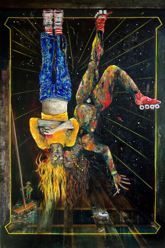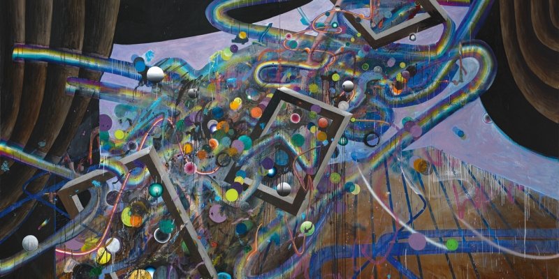Each artwork presents the childlike joy and liberty of Achenbach’s brush with an immanent nod to the history of modern art. Modernism, Dadaism and Cubism are undeniably present in each painting where no central motif is to be found, but geometric shapes and symbols instead rhizomatically spirals in and out of each other. Much like the music in which Achenbach finds his inspiration, the definite outlines are blurry, the array of colors explosive.
