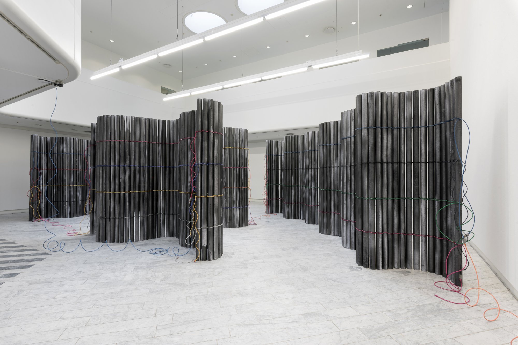 I David Stjernholms værk The Buzz fra 2014 i galleriet Last Resort var et rum formet af gipsvægge med strålingshæmmende maling. Japanske forkullede binchotan-egetræsgrene, berømte for at kunne rense vand, var opsat på galleriets vægge, og ledninger var trukket igennem installationen. De formede et sluttet kredsløb, hvor omgivelsernes stråler ikke kunne trænge ind. Et værk, som fremstod på én gang rent og samtidigt mættet af referencer til de usynlige lag, vi er påvirket af i vores daglige færdsel i verden.