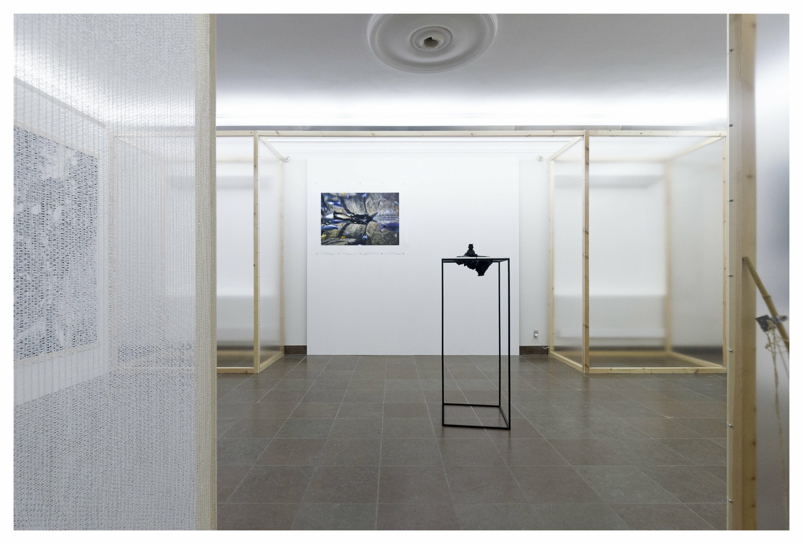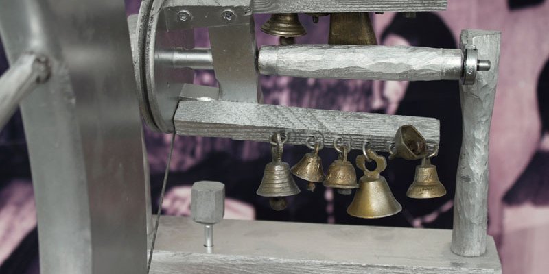 Sorte gummireb hænger fra jernstænger i loftet, massive aluminiumstænger balancerer, akrylplast stiger op, og en krystalkugle spejler rummet fra dens ydmyge gummirebssokkel.